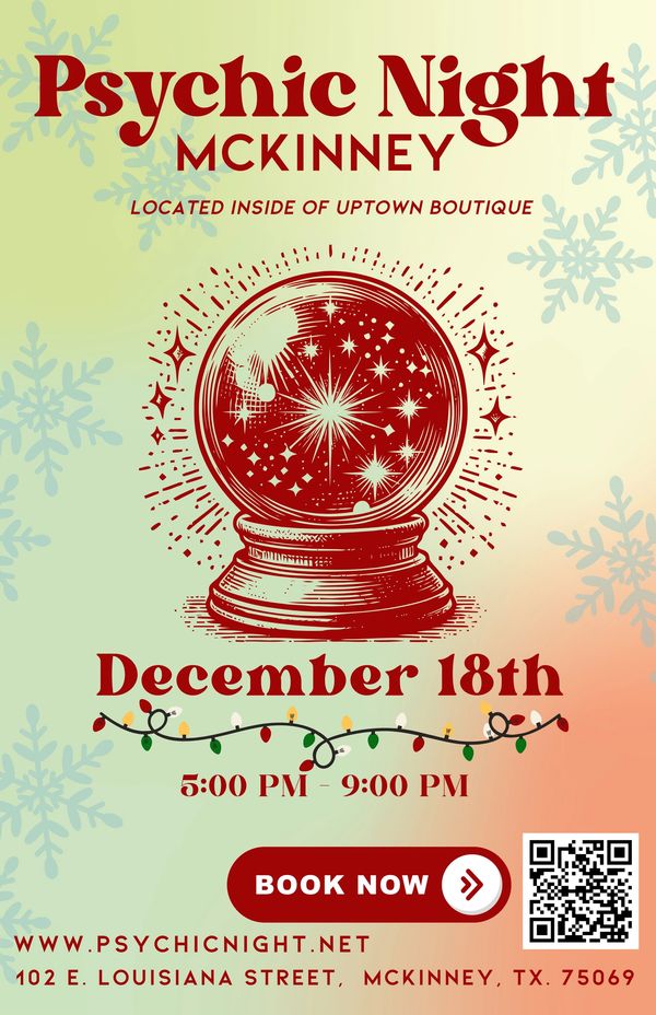 Psychic Night, a longstanding tradition in Downtown Mckinney, is a monthly gathering where people can connect with our rotation of expert readers to gain clarity, receive answers to their question, and find illumination on their life's path. During a reading, you have the opportunity to seek general insight into your life's circumstances or receive divine guidance on specific events. Our readers provide sessions that offer both general spiritual insight and the option to delve into specific circumstances based on your individual needs and goals. With a wide array of gifts, our readers encompass various specialties, including Tarot, Mediumship, Astrology, Reiki and more. Each psychic possesses unique abilities and intuitive skills, infusing their own personality and modalities into every session.